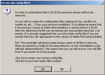 If you are installing over an older version of Admin Mod you will be asked if you wish to retain your old configuration files. In some cases this is not a good idea because your old files will not contain any Cvars introduced in the new version.