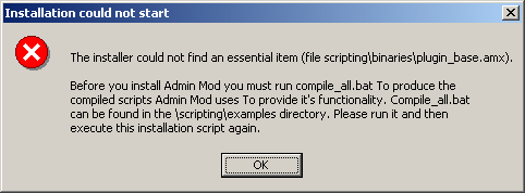 If you have made a mistake extracing admin mod or have deleted the precompiled scripts supplied with Admin Mod you will presented with a dialigue like the one below indicating a problem with the distribution and preventing you from installing Admin Mod.