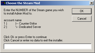 If you chose to install to a STEAM install you will be asked which account you wish to install Admin Mod into. This takes the form of a multiple choice, as before you must input the number to the left of the choice you want. Only the number, nothing else. An example of this choice is pictured below.