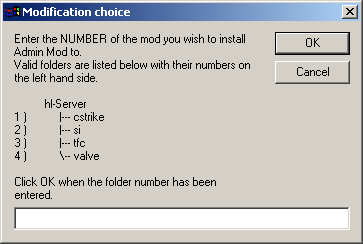 Simply choose the Mod folder that corresponds to the Mod you wish to use Admin with and type in its number from the list on the left hand side. Each folder presented corresponds to a mod that can be installed to. If a mod is not in this list then the installer cannot install Admin Mod to it.