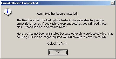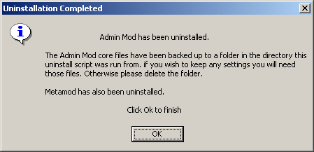If there are no other Metamod dlls installed Metamod will be uninstalled along with Admin Mod and the following dialogue will be shown.